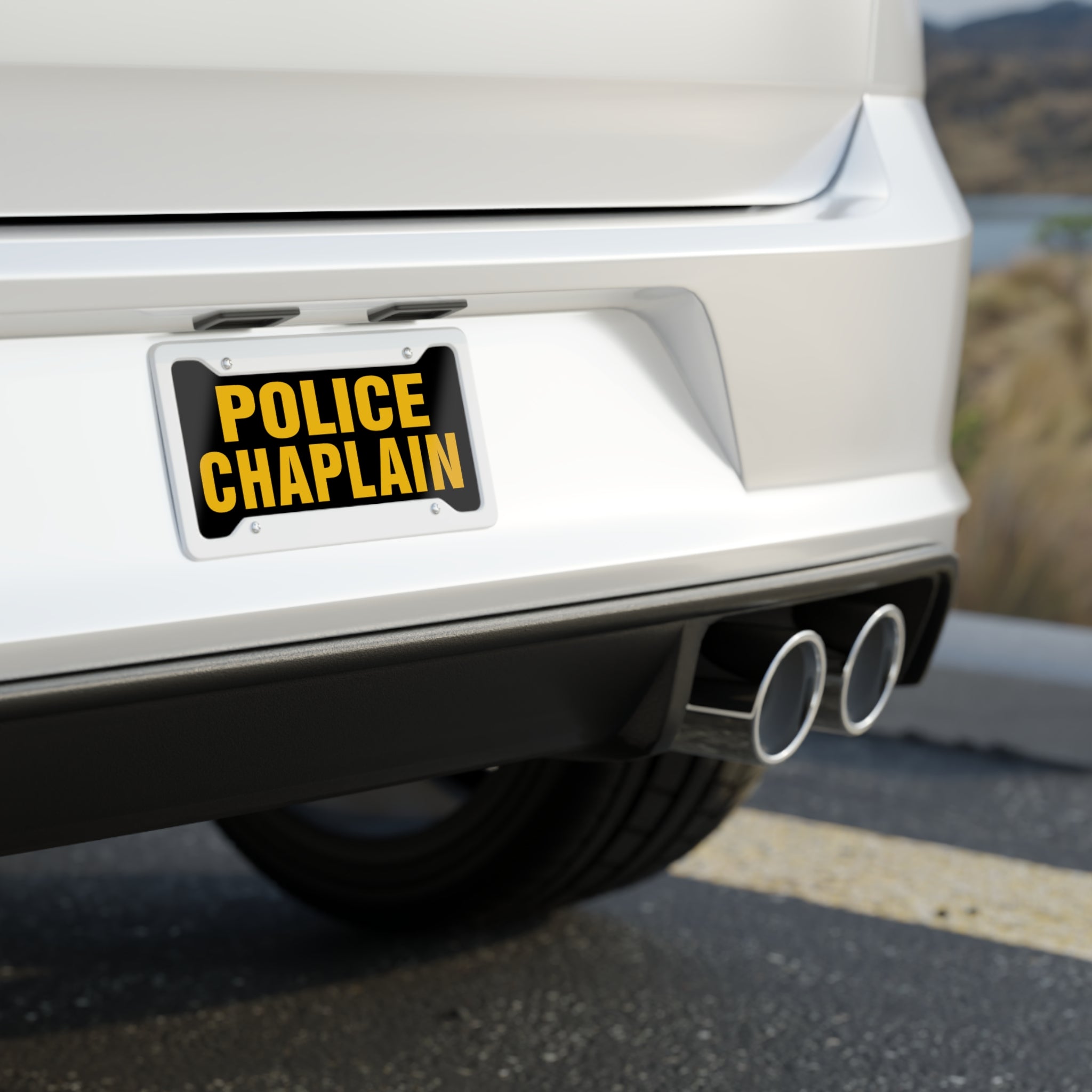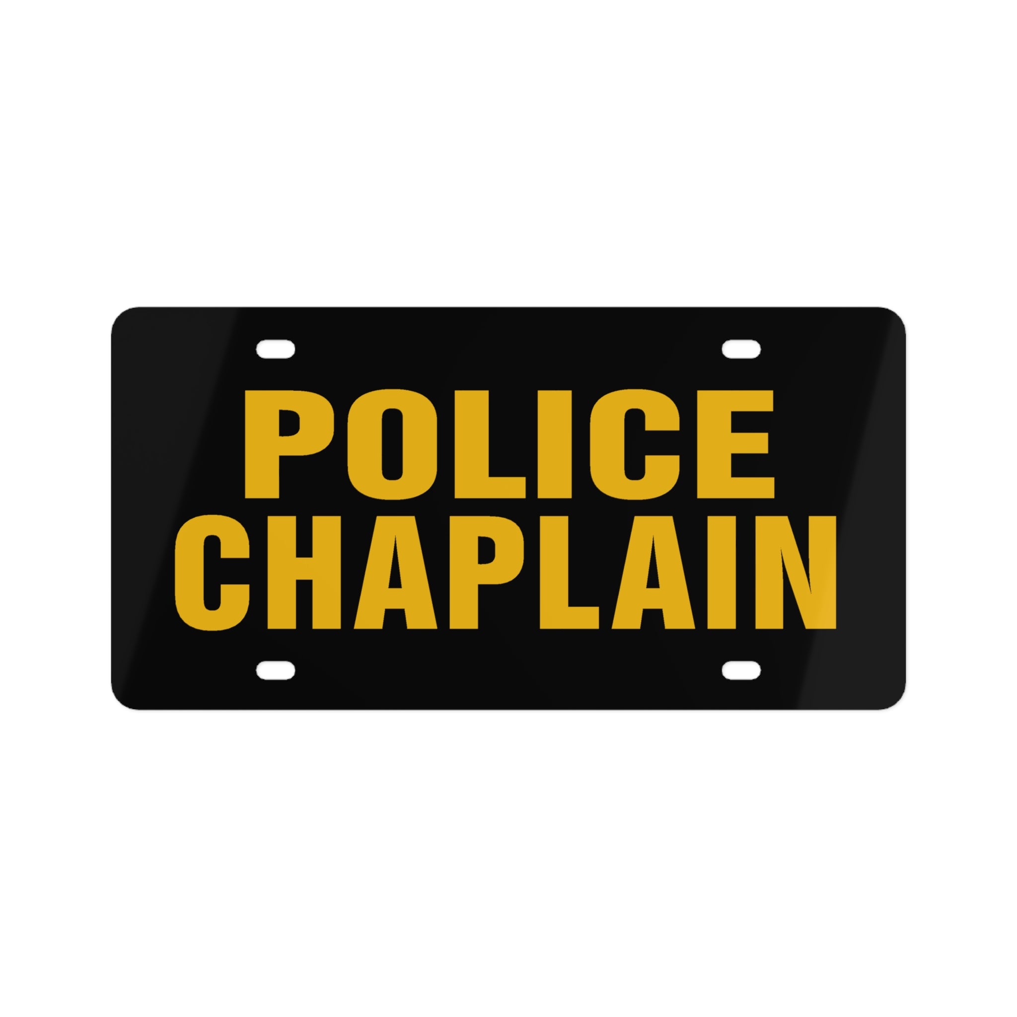 Black aluminum license plate with bold, gold lettering that reads “POLICE CHAPLAIN.” It feels authoritative without being flashy — a quiet badge of presence for someone who walks alongside first responders. Mount it on your vehicle to signal your role and open gentle doors of recognition. The matte finish keeps glare low while vibrant printing ensures the message stays crisp. Lightweight and pre-drilled for fast installation, it slips easily into standard covers and lets you move between scenes with a clear, respectful emblem of service.